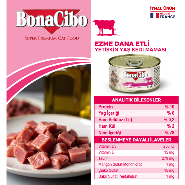 İçindekiler: : Et ve hayvansal ürünler (%4 Dana eti), Bitkisel ürünler, mineraller.